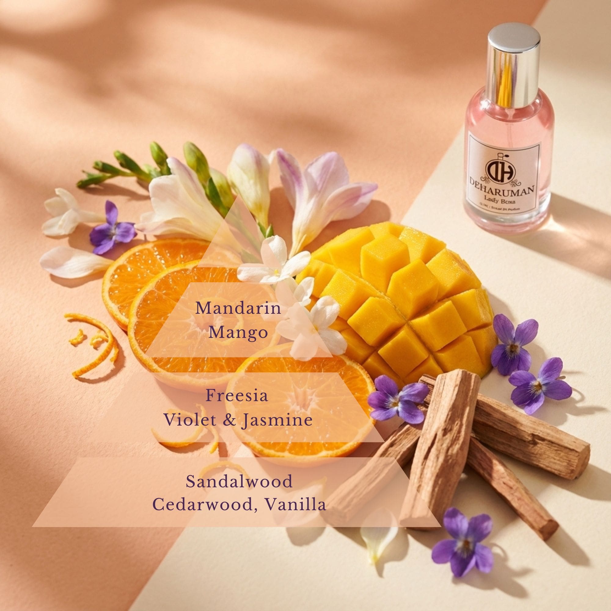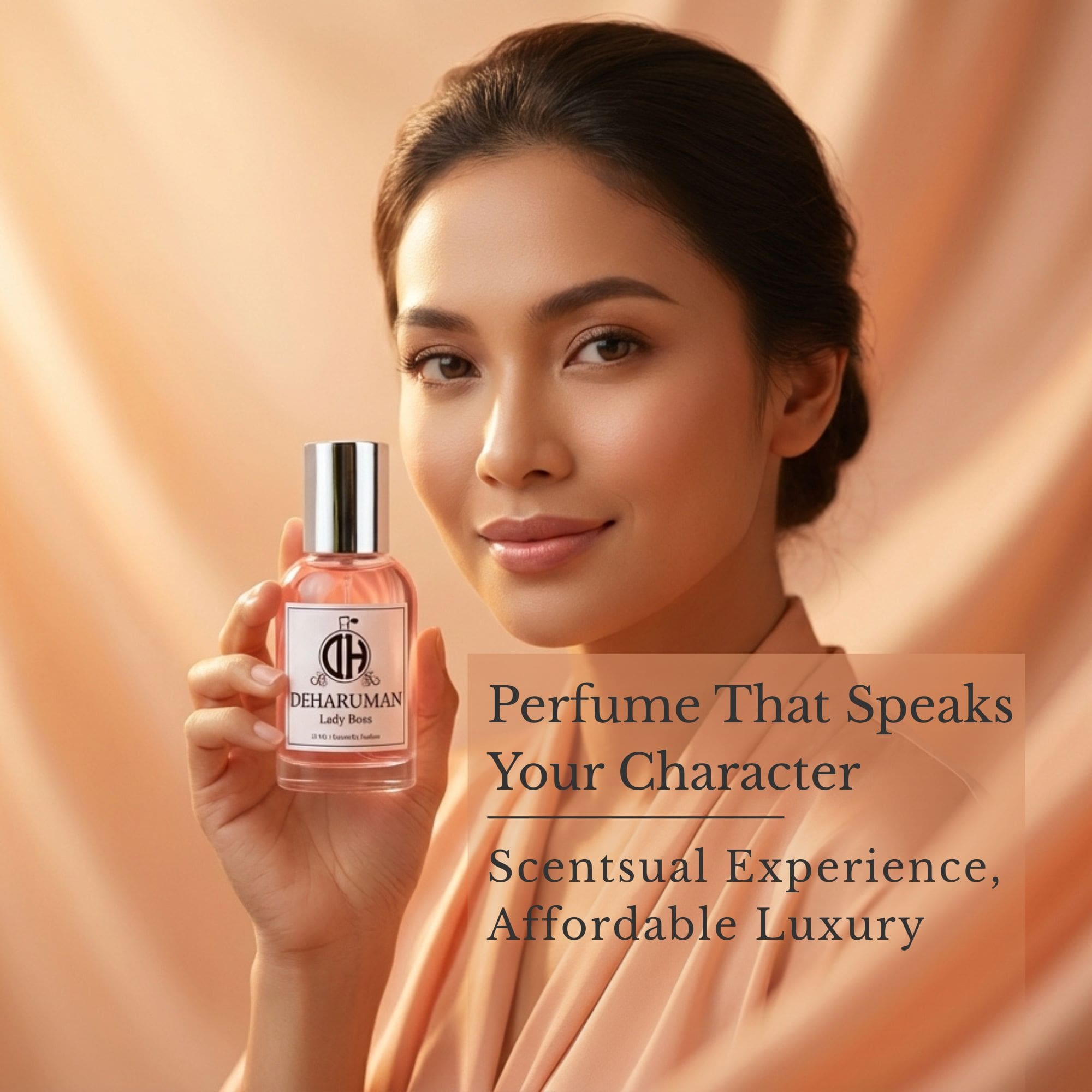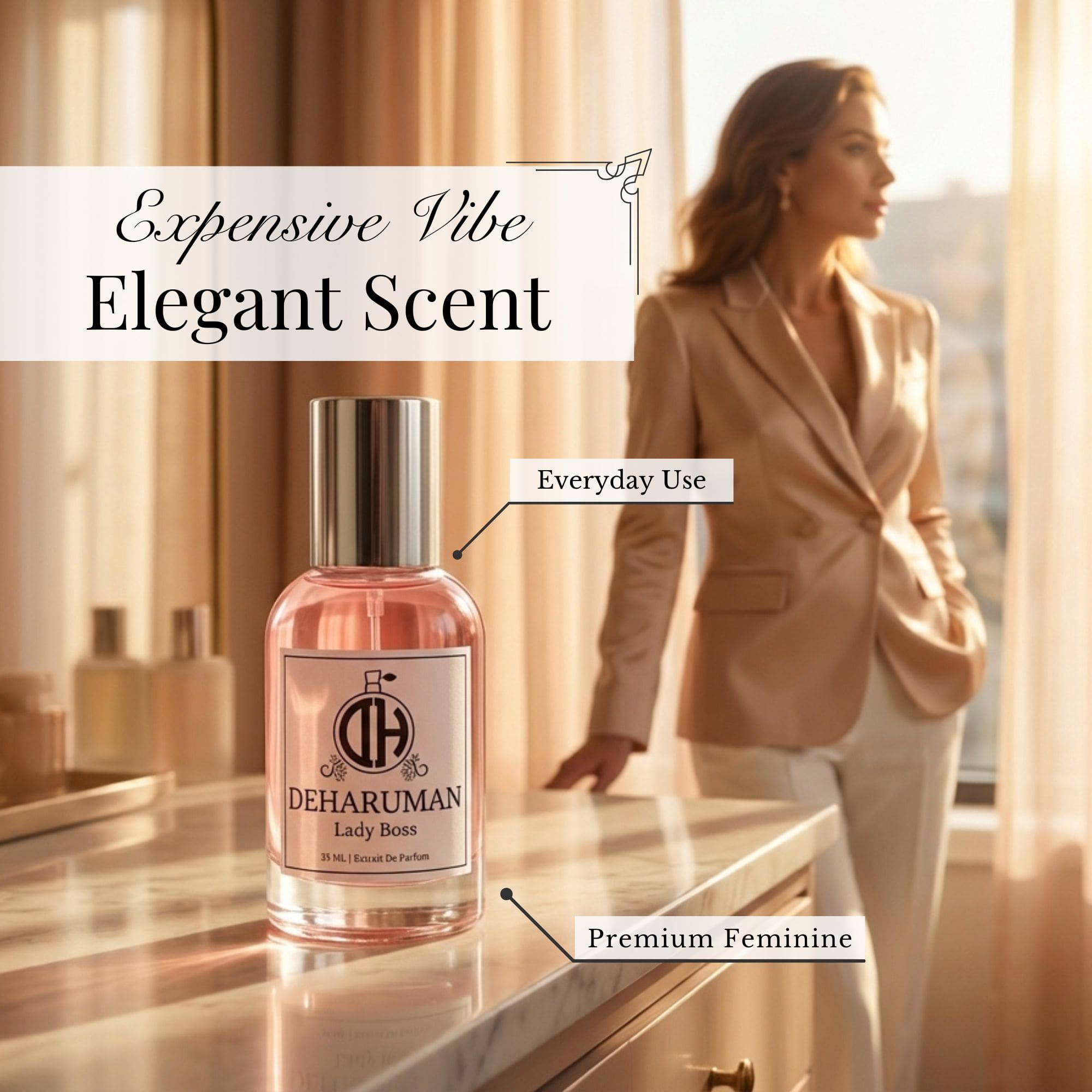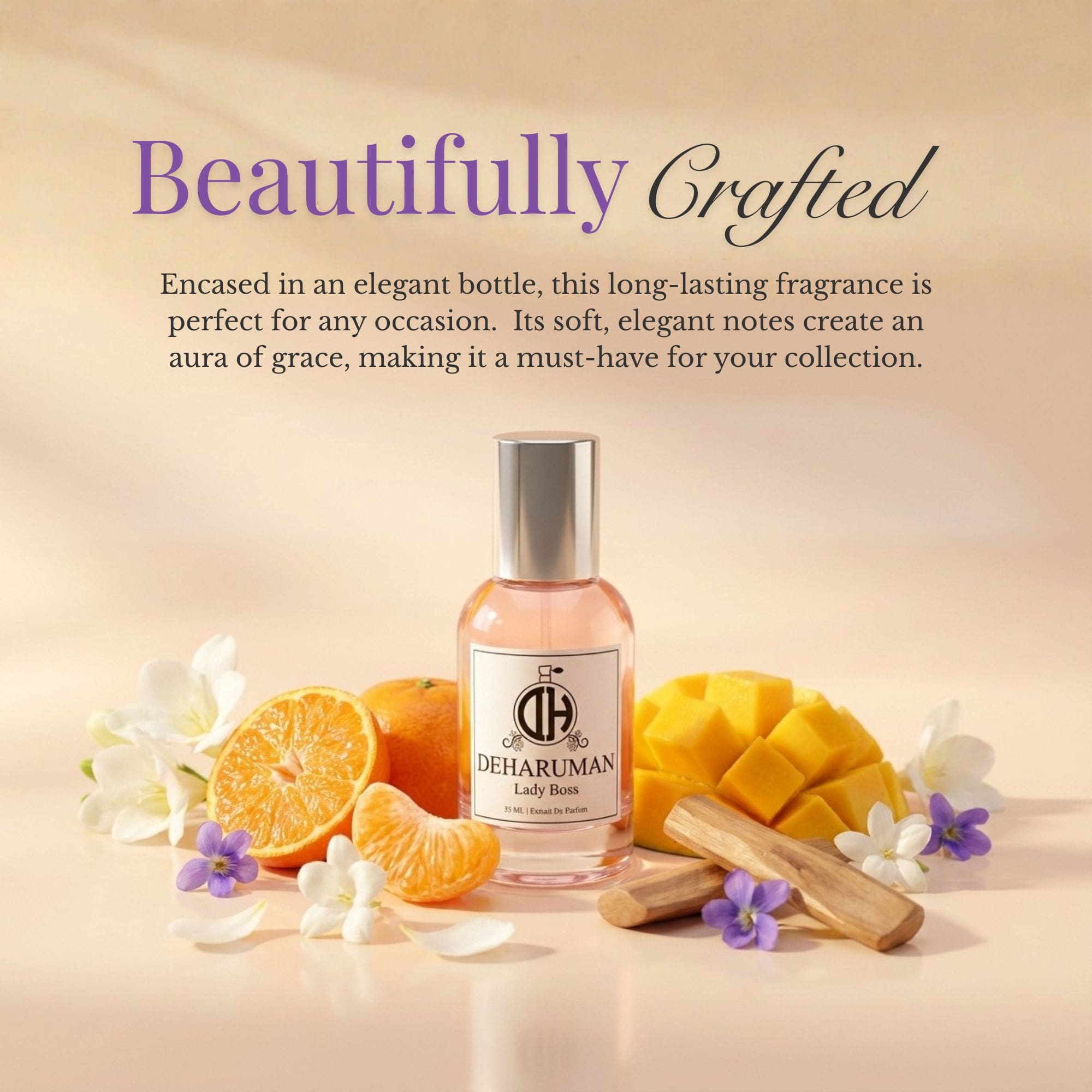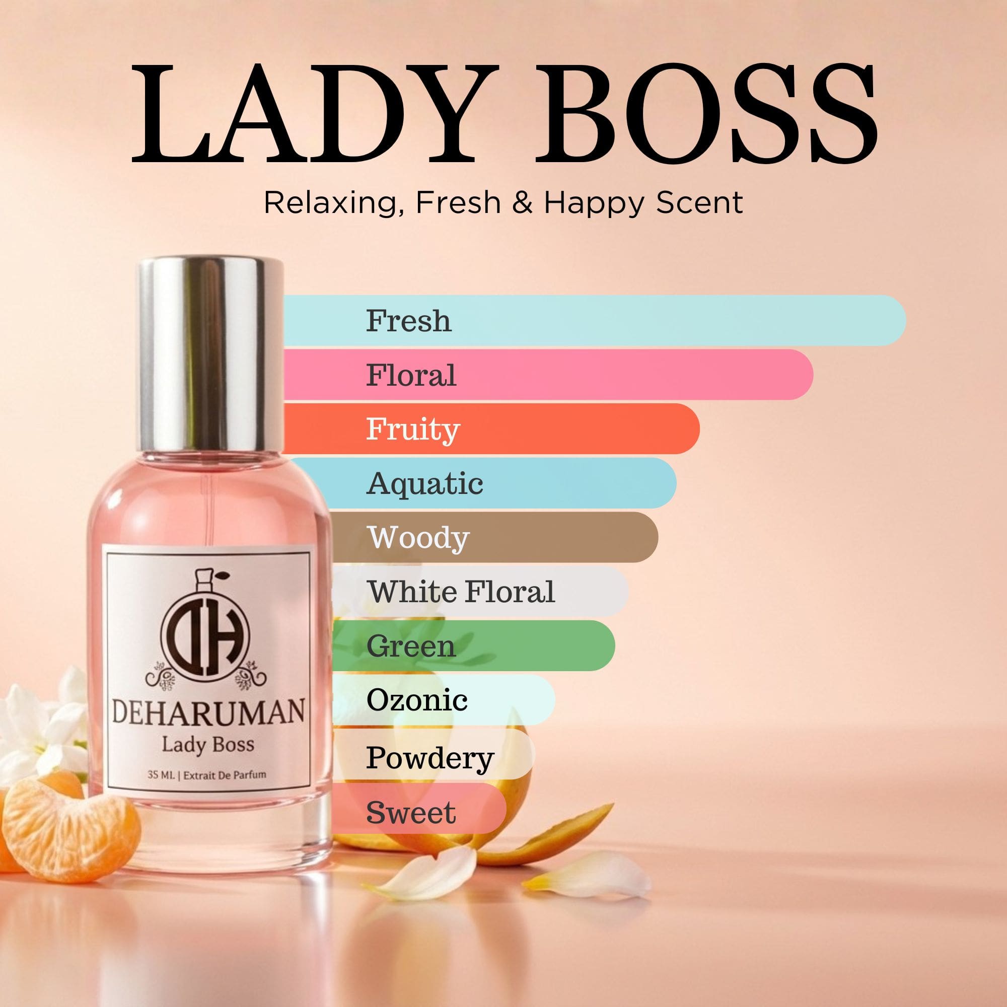 Introducing Lady Boss: a floral and fruity perfume designed for the modern, confident woman. Elevate your scent game with our exclusive collection. Experience the allure today